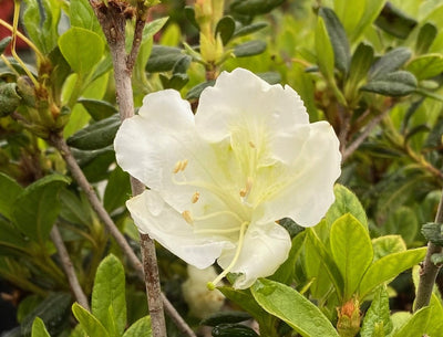 A reblooming azalea with loads of large, single white flowers in spring, some sporadic summer flowers, and then masses of late summer and fall flowers. Use in mass plantings, beds and borders. Will brighten any spot in your landscape.
