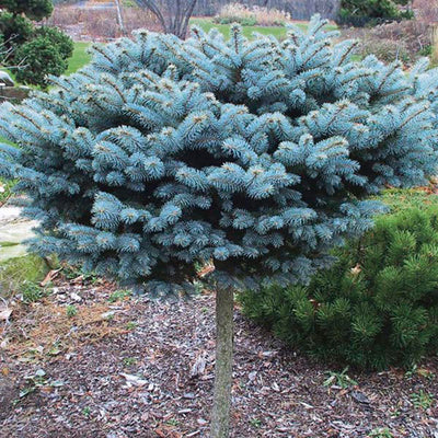 Rounded mound of silvery-blue needles grown atop a tall stem adds height and an interesting touch to the landscape. This slow growing evergreen will retain its shape with minimal care for years. The height will remains steady, but the stem will broaden.