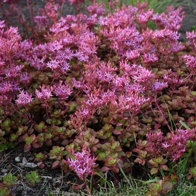 An improved 'Dragon's Blood' with rose-red flowers on short stems. Bronze-red foliage that keeps its color all season. Excellent groundcover for sunny locations. Grows 3 - 4" tall.