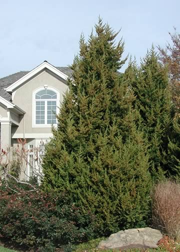 Vigorous, pyramidal, evergreen tree. Foliage is bright green, taking on a purple cast in winter. Will tolerate wet soils. Growth rate is moderate to fast, with a dense habit.